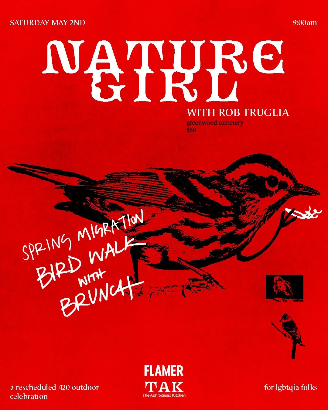 Join us for a few (optional) hits of a FLAMER joint at at Greenwood Cemetery, a stop-over habitat for over 185 species of migrating birds annually. In April, the grounds feature migrating songbirds, nesting Monk Parakeets, and early spring arrivals like Pine Warblers and woodpeckers. If you have binoculars, bring them! Otherwise, we will have plenty to share. Brunch will be served at 10:30 am -- with local and seasonal produce. The meet up location will be sent the night before.